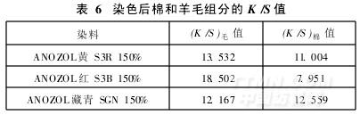(3)按最佳酶精練-氧漂工藝處理的棉、毛散纖維,采用ANOZOL常規(guī)棉用活性染料一浴一步法染色后,部分染料染色后兩組分的表觀深度一致,達到較好的染色同色性。