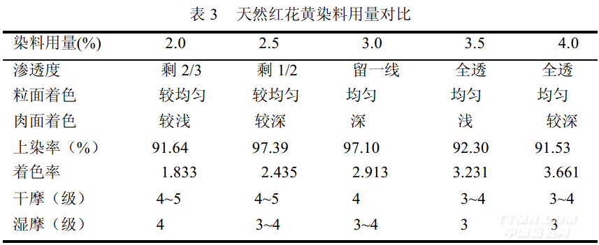 從表2和表3可以看出:?jiǎn)为?dú)使用時(shí),隨著染料用量的增加,兩種天然染料的上染率均先上升后逐漸下降,而著色率均逐漸提高。染料用量少時(shí),其粒面及肉面著色程度反而深,原因可能是當(dāng)用量太少時(shí),只能吸附在皮的表面,難以滲透到內(nèi)部。因此可以認(rèn)為3.5%、7.0%分別是天然紅花黃和梔子黃染料染色的飽和用量。另外還可以看出,天然紅花黃染料的干、濕摩擦色牢度較好,而天然梔子黃則一般,但是對(duì)于皮革來(lái)說(shuō)后期還要進(jìn)行適當(dāng)?shù)耐匡椪恚?級(jí)左右的摩擦牢度還可以接受。