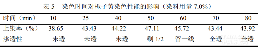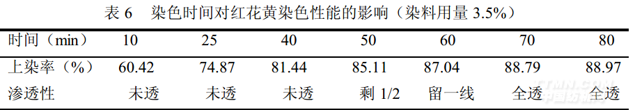 試驗(yàn)中同時(shí)選擇厚度、大小、部位相近、中和深透的鉻復(fù)鞣皮8塊進(jìn)行染色,每隔一定時(shí)間做皮革切口滲透性和染料上染率的測(cè)定,得到如表5、表6結(jié)果,可以看出隨著染色時(shí)間的延長(zhǎng),兩種染料的上染率提高。當(dāng)染色時(shí)間為70min時(shí),皮染透,上染率接近最大,染色基本達(dá)到平衡,即使再延長(zhǎng)時(shí)間,上染率提高不大。因此染色時(shí)間控制在70min為宜。