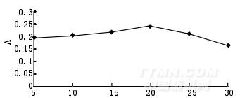 從圖5可以看出,隨著固液比的增大,色素提取效果逐漸增強,當固液比達到1:20后,提取效果反而下降,故確定最佳固液比為1:20。
