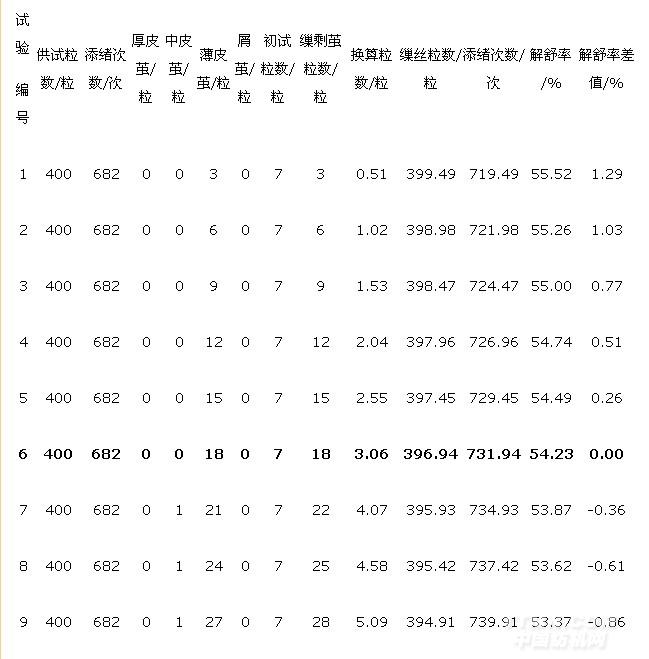 檢驗實踐證明,解舒試驗時應(yīng)在保持試驗規(guī)定纖度的前提下,按照繅剩繭數(shù)量較少,無厚皮繭、基本無中皮繭、有少量薄皮繭,蛹襯厚度適中的基本要求進行試驗,將有效提高解舒率指標(biāo)檢測的準(zhǔn)確性。