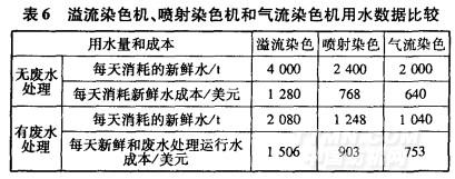 以日產(chǎn)量為4o噸的棉染色工廠為例,分析了采用的染色機(jī)和廢水回用對環(huán)境和經(jīng)濟(jì)成本的影響。采用三種染色設(shè)備——溢流染色機(jī)、噴射染色機(jī)和氣流染色機(jī)。表5是工廠的一些運(yùn)行數(shù)據(jù)。溢流染色機(jī)、噴射染色機(jī)和氣流染色機(jī)的染色浴比分別是1:10,1:5和1:4。每千克棉在這三種染色機(jī)中進(jìn)行前處理、染色和后處理的用水量分別是100,60和5OL。