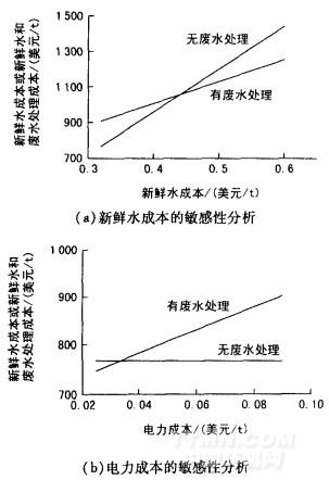 表6是采用3種染色設(shè)備的用水?dāng)?shù)據(jù)。溢流染色機(jī)每天需要4000t新鮮水,遠(yuǎn)高于噴射染色機(jī)(2400t)和氣流染色機(jī)(2000t)。Kazakevieiute等對噴射染色機(jī)和氣流染色機(jī)的水、熱能和化學(xué)品的消耗量進(jìn)行分析比較,也發(fā)現(xiàn)后者的消耗量更少。如果采用此廢水處理廠,那么48%的水可回用于染色工藝。對于溢流染色機(jī)、噴射染色機(jī)和氣流染色機(jī)而言,每天新鮮水的消耗量可分別減少到2080,l248和1040t。假設(shè)每噸水的價格是0.32美元,那么采用這3種設(shè)備時新鮮水和廢水處理的總成本分別是每天1506,903和753美元。圖3(a)的敏感性分析(譯注:敏感性分析法是指從眾多不確定性因素中找出對投資項(xiàng)目經(jīng)濟(jì)效益指標(biāo)有重要影響的敏感性因素,并分析、測算其對項(xiàng)目經(jīng)濟(jì)效益指標(biāo)的影響程度和敏感性程度,進(jìn)而判斷項(xiàng)目承受風(fēng)險能力的一種不確定性分析方法)表明,一旦新鮮水的價格超過0.44美元/噸,工藝用水的回用將會更加經(jīng)濟(jì)。這一結(jié)論表明,對于印染廠,工藝用水回用帶來的經(jīng)濟(jì)性是非常吸引人的。圖3(b)和圖3(c)的電力(0.03美噸)和化學(xué)品(0.06美元/噸)成本數(shù)據(jù)也顯示了相似的結(jié)論。