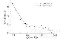 由圖8可知,Gly-Gly-MIPMs的Scatchard曲線存在2段具有良好線性關系的直線,而NMIPMs的Scatchard曲線(圖9)則呈明顯的線性關系,說明Gly-Gly-MIPMs對模板分子Gly-Gly存在2類不同的結合位點,第I類屬于要由范德華力、氫鍵等非特異性吸附所產生的低親和力結合位點,飽和吸附量為0.1080mmol/g,而第II類結合位點的飽和吸附量是I類結合位點的3.94倍,這說明II類結合位點與模板分子的結合較強,數(shù)量也相對較多,該位點的強吸附作用則由形狀和官能團互補的印跡孔穴所產生,即特異性吸附。同時,對比NMIPMs的Scatchard模型計算結果發(fā)現(xiàn),NMIPMs對模板分子Gly-Gly僅存在1類結合位點,其單位飽和吸附量Qmax