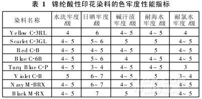 目前,錦綸彈性泳衣直接印花以弱酸性染料為主,中深色印花可用或拼用中性染料。本試驗通過酸性印花染料及印花助劑的選擇,對印花各工序的控制,生產出高精細度、高色牢度和色澤艷麗、彈性好的錦/氨綸經(jīng)編印花面料。