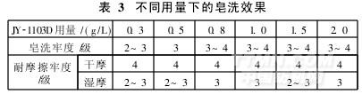 皂洗工藝條件同上,不同JY-1103D用量下的皂洗效果見表3。