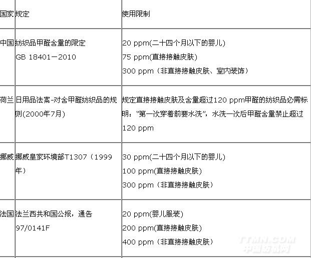 表1世界各國出的法規(guī)或標(biāo)準(zhǔn)對游離甲醛的限定