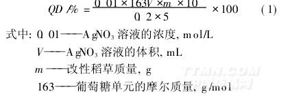 取0. 2 g按1. 2節(jié)方法配制的稻草秸稈季銨鹽,用100 mL去離子水溶解,攪拌均勻;以0. 01 mol/L AgNO3溶液通過(guò)電位滴定法測(cè)Cl-濃度,其季銨化度(QD)按式(1)計(jì)算:
