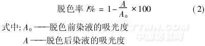 取30 mL配制的100 mg/L活性橙K-GN溶液于150 mL錐形瓶中,用稀釋的HCl溶液或NaOH溶液調(diào)節(jié)染液pH值,加入一定量按1. 2節(jié)方法配制的稻草季銨鹽,用S212恒速攪拌器攪拌。先以150 r/min的速度快攪5 min,再以50 r/min的速度慢攪10 min,靜置3 h,用注射器吸取上層澄清液,以紫外可見(jiàn)分光光度計(jì)測(cè)定上層清夜的吸光度,活性橙K-GN的最大吸收波長(zhǎng)為462 nm,此時(shí)的吸光度為1. 504 5。脫色效果按式(2)計(jì)算: