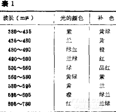 光的波長范圍大約在&.8×1O 厘米(即38Om )和7.8×10 (即780mp.)之間,是能對人們的視覺器官引起視覺的部分。由一個波長的光波所組成的光叫單色光。不同渡長的單色光,在人的視覺上產(chǎn)生不同的色。一定波長的光與另一定波長的光.若以適當(dāng)?shù)谋鹊够旌?,能生成自光,這二種光便相互稱為補(bǔ)色。例如:一定量的黃光和蘭光混合后,成為自光,于是黃光與蘭光便互為補(bǔ)色。一種染料能選擇吸收蘭光,則它較多地反射黃光,此染料呈黃。若染料較多地吸收綠光,則此染料呈品紅色。若該染料對可見光各波段的光波能平均l吸收,則此染料呈灰色。不同波長的光,所呈現(xiàn)的色澤及其補(bǔ)色,如表l所示。