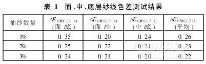 染色后分別取一個(gè)筒子的面、中、底層紗1%、2%、3%織片,織片后三種纖維的同色性較好。采用Datacolor650 TM型測(cè)色儀測(cè)試面、中、底層紗線(xiàn)色差,結(jié)果見(jiàn)表1。