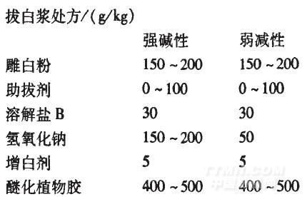 如果采用半拔染工藝(也稱為防拔染印花工藝),拔白效果會(huì)比全拔染效果好,適用的染料品種也較廣,無(wú)論乙烯砜型活性染料,還是一氯均三嗪型活性染料,均有很好的拔染效果。但該工藝在實(shí)施過(guò)程中應(yīng)嚴(yán)格控制:(1)浸軋活性染料后的烘干溫度不能超過(guò)80℃,盡可能采用熱風(fēng)烘燥;(2)軋染后應(yīng)立即印花,以防止未固著的活性染料受酸氣影響而“失風(fēng)”變色。