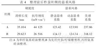 由表4 可知,先經(jīng)絲肽/檸檬酸整理,再經(jīng)氨基硅油整理后的柞蠶絲織物更加柔軟,懸垂風(fēng)格得到進(jìn)一步改善.