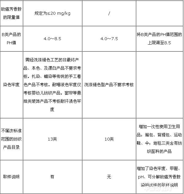 GB 18401—2003《國(guó)家紡織產(chǎn)品基本安全技術(shù)規(guī)范》(以下簡(jiǎn)稱老標(biāo)準(zhǔn))的實(shí)施為我國(guó)紡織產(chǎn)品的生產(chǎn)、銷售、使用和監(jiān)督提供了統(tǒng)一的技術(shù)依據(jù),對(duì)于有效保護(hù)我國(guó)紡織消費(fèi)者的健康,規(guī)范市場(chǎng)以及提高我國(guó)紡織行業(yè)的整體水平和國(guó)際競(jìng)爭(zhēng)力發(fā)揮了重要作用。將于2011年8月1日實(shí)施的GB 18401-2010《國(guó)家紡織產(chǎn)品基本安全技術(shù)規(guī)范》(以下簡(jiǎn)稱新標(biāo)準(zhǔn))相比于老標(biāo)準(zhǔn),無(wú)論是指標(biāo)要求還測(cè)試方法,都有一些新的變化。條款規(guī)定更清楚,可操作性更強(qiáng),對(duì)紡織品企業(yè)在生產(chǎn)和銷售等環(huán)節(jié)都提出了更加嚴(yán)格的要求。認(rèn)真貫徹落實(shí)新標(biāo)準(zhǔn)將更有效的保護(hù)我國(guó)消費(fèi)者健康,引導(dǎo)紡織品生產(chǎn)銷售企業(yè)注重產(chǎn)品質(zhì)量,有助于提升我國(guó)企業(yè)市場(chǎng)競(jìng)爭(zhēng)力和積極應(yīng)對(duì)國(guó)外技術(shù)性貿(mào)易壁壘。為了更好的貫徹落實(shí)新的標(biāo)準(zhǔn),本文將新老標(biāo)準(zhǔn)作對(duì)比,詳細(xì)介紹新增的考核內(nèi)容和要求,并對(duì)重要考核指標(biāo)進(jìn)行解讀。