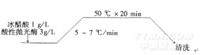 為保證均勻吸附,陽離子化時(shí)一般將升溫速率控制在3~5℃/min,某些情況下升溫速率要更慢些,因?yàn)樯郎靥鞎?huì)造成不可逆轉(zhuǎn)的陽離子不均勻吸收;在升溫階段蒸汽不可直接接觸服裝,否則會(huì)造成陽離子化助劑在溫度較高的部位聚集,導(dǎo)致涂料染色不勻現(xiàn)象。陽離子助劑在溫度高于50℃時(shí)已能基本吸盡,實(shí)際生產(chǎn)時(shí)一般控制在70℃左右。