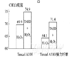 由于TAED具有低溫漂白作用,促進了纖維素纖維、蛋白質(zhì)纖維等紡織品的低溫氧漂工藝的應(yīng)用[3-6],在低溫條件下白度明顯高于單獨使用雙氧水,減少纖維在高溫下的損傷程度[7]。圖1和圖2顯示TAED+H2O2和單獨H2O2的白度值和拉伸強度的比較。它們是在pH=10·5,溫度70℃, 1小時氧漂工藝條件下的結(jié)果。