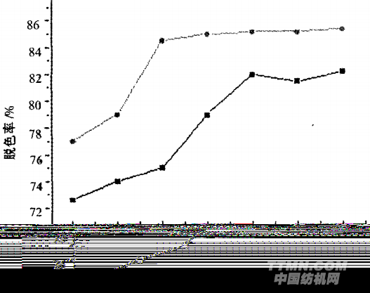 由圖2可以看出,當(dāng)投加量為8O mg/100 mL時(shí),泥炭對(duì)活性嫩黃K-6G的脫色率可達(dá)82 ,加大投加量,脫色效率提高不明顯。對(duì)于此種染料液,最佳投加量為8O mg/100 mL。對(duì)活性深藍(lán)K—R,最佳投加量為60 mg/100 mL,脫色率達(dá)85 。