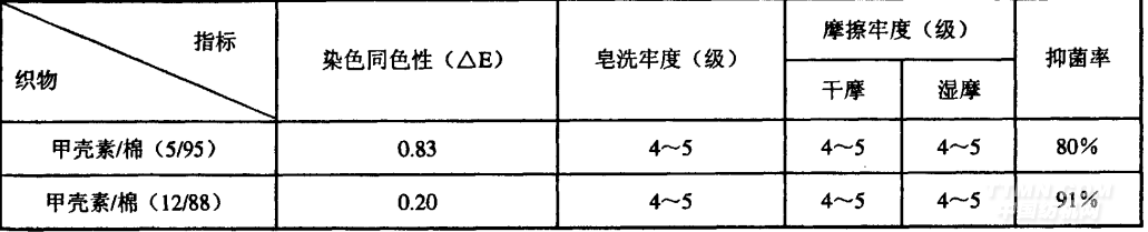 采用上述最佳改性工藝,對甲殼素,棉混紡織物進行預處理,再按2.2.4工藝進行染色、后整理。測試所得成品的染色同色性和色牢度等性能,結果如表5所示。