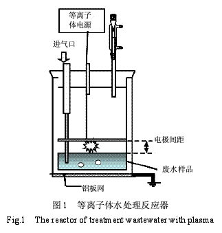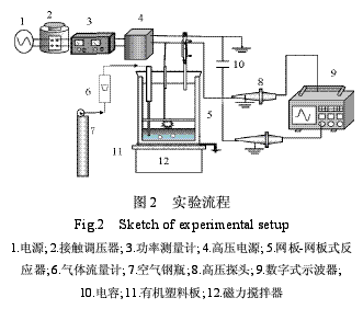 實(shí)驗(yàn)裝置主要由高壓電源和低溫等離子體水處理反應(yīng)器組成.反應(yīng)器放置在磁力恒溫?cái)嚢杵魃?其間用厚度10mm有機(jī)玻璃平板隔開,防止系統(tǒng)漏電.反應(yīng)器上部開口用硅橡膠塞密封,并預(yù)留3個(gè)開孔,分別設(shè)置進(jìn)氣管、出氣孔和陽極連接線.一定流量的穩(wěn)定壓縮空氣由進(jìn)氣管進(jìn)入反應(yīng)器,出口氣體分布器設(shè)置在液面下.出氣孔上端連接雙層玻璃冷凝管,冷凝在等離子體放電過程中產(chǎn)生的水蒸氣,并回流到反應(yīng)器,以免影響水質(zhì)分析結(jié)果.