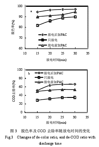 取初始濃度200mg(固體染料粉末)/L(水)(CODCr初始值572,下同)溶液50mL、放電間距8mm、空氣流量16L/h,輸入電壓40kV,放電時(shí)間15~30min,分別在放電前、后樣品中加入絮凝劑PAC(先配制成濃度20%PAC溶液,該溶液加入量為廢水體積5%,下同),快速攪拌后再緩慢攪拌,靜止1h分層,取上清液測(cè)試并計(jì)算不同實(shí)驗(yàn)條件下(廢水不加絮凝劑僅放電、廢水放電前加絮凝劑、廢水放電后加絮凝劑)放電時(shí)間和溶液脫色率以及COD去除率關(guān)系見圖3.