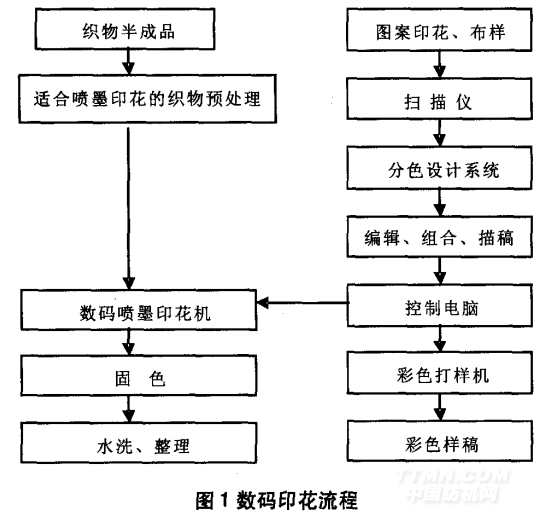 4)快速反應,零庫存生產(chǎn),生產(chǎn)過程數(shù)字化,印制效果一致,徹底改善印花生產(chǎn)的環(huán)境。采用數(shù)碼印花技術(shù)可以很方便地設(shè)計和核對花樣和圖案,提供高分辨率和準確的樣品,其工藝見圖1。
