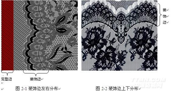 定型邊是分布在面料的最外側左右兩邊,坯布拉幅定型時起加固作用的結構。裝飾邊會跟面料主體花型一起應用于服裝制作中,而且會著重突出其特點;定型邊只是在坯布定型階段起到連接、加固的作用,在面料裁剪、制作服裝的過程中就被剪掉了。有些面料只有定型邊,有些面料裝飾邊和定型邊都有,但是每幅面料一定要有定型邊,否則在坯布定型時,面料容易被拉壞。因此裝飾邊分布在上下位置的多梳拉舍爾面料,其左右還有兩個定型邊,整幅面料呈矩形狀。
