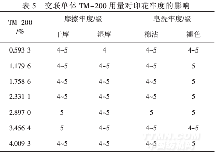 TM-200是含有雙鍵和其他功能性官能團(tuán)的市售交聯(lián)單體,乳液聚合時通過雙鍵聚合于高聚物上.在印花時發(fā)現(xiàn),TM-200用量為0.593 3%和4.009 3%(對單體總質(zhì)量)時,印花糊在調(diào)制和使用過程中易出現(xiàn)破乳、堵網(wǎng)現(xiàn)象,織物印花輪廓不清晰.從表5可知,當(dāng)交聯(lián)單體用量為2.897 0%時,印花織物的摩擦牢度和皂洗牢度都較好,故選擇交聯(lián)單體用量2.897%.