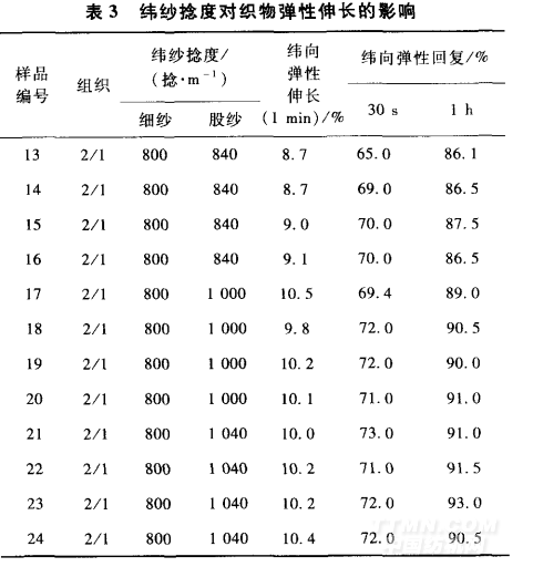 毛紗(細紗/股紗)捻度變化對織物彈性伸長的影響見表3。由表3可以看出,捻度大的織物伸長和回復好。PTT纖維混紡毛紗的捻度比常規(guī)捻度高 出40~80捻/m,對織物的彈性改善比較大。