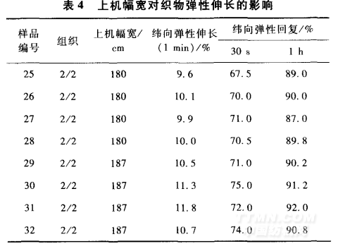 由表4可以看出,上機幅寬略小時,織物伸長和回復都在合格值的邊緣,不易合格。上機幅寬增大5 cm以上后,織物伸長和回復比較穩(wěn)定,試驗數(shù)據(jù)