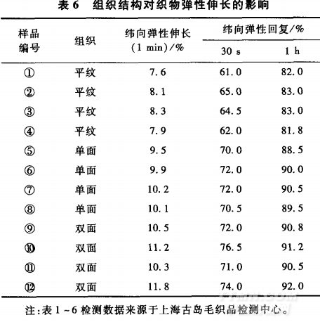在其他參數(shù)不變的情況下,組織結(jié)構(gòu)對織物的緯向彈性影響比較大。平紋組織,單面嗶嘰2/1,雙面組織2/2,2/2變化組織對織物彈性伸長的影響見表6。由表6可以看出,結(jié)構(gòu)較松及長浮線織物,緯向伸長和回復(fù)率比較好…。
