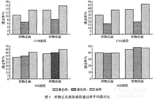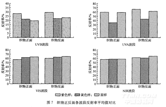 從圖7中可以看出,在UVB波段,紫色樣正反 在VIS和NIR波段,黃色和紫色樣正反面反射 面反射率比原樣和黃色樣高,在UVA波段,紫色樣 率比原樣也有所減少。在vIs~a,黃色樣反射率值正反面反射率與原樣幾乎一樣,均高于黃色樣。 下降得比較少,正反面反射率達(dá)到62.O6%oN62.90%,與原樣相比減少了1.24 和1.8 ,在NIR波段,黃色和紫色反射率與原樣相比雖然有所減少,但是十分接近,對(duì)反射率影響同樣不大。從圖6、圖7中看出,在紫外線和可見(jiàn)光波段,染色后織物的平均透過(guò)率均低于原樣。說(shuō)明染色會(huì)削弱Tricot 經(jīng)編織物的透光,隱視的效果,但是可以提高紫外線的防護(hù)能力。