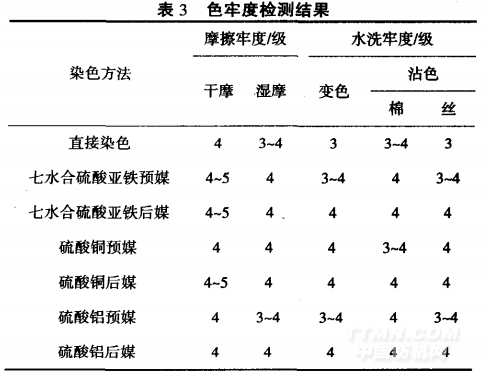由表3可知,青核桃皮色素染色柞蠶絲織物的耐水洗牢度及干、濕摩擦色牢度均≥3級,滿足服裝服用要求.預媒法染色比后媒法染色色牢度略差。但均比直接染色好.