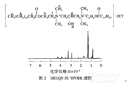 由圖1可知,3143cm-1為—OH的伸縮振動(dòng)吸收峰,2914、2851 cm-1為—CH3或—CH2中的C—H對(duì)稱伸縮振動(dòng)吸收峰,1732 cm-1為COO-中的C=O伸縮振動(dòng)吸收峰,l468 cm-1為—CH3中的C—H彎曲動(dòng)吸收峰,1389cm為—CH2—CO一中C—H面內(nèi)振動(dòng)吸收峰,l175 cm-1為COO-中C—O—的伸縮振動(dòng)吸收峰,923~989 cm-1為季銨鹽的特征吸收峰,721 cm-1為—CH中C—H的面外搖擺振動(dòng)吸收峰.這些與目標(biāo)產(chǎn)物結(jié)構(gòu)基本吻合.