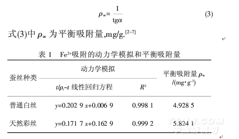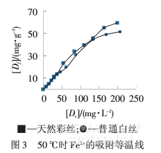 從表2普通白絲和天然彩絲擬合之后的2種吸附模型可見,Langmuir吸附平衡模型模擬結(jié)果的相關(guān)系數(shù)高于Freundlich模擬,Fe2+與蠶絲纖維發(fā)生絡(luò)合并穩(wěn)定存在.普通白絲和天然彩絲對Fe2+的吸附屬于Langmuir型吸附.