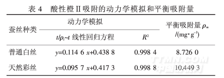 由表4可以看出,當(dāng)吸附達(dá)到平衡后,天然彩絲對(duì)酸性橙Ⅱ的平衡吸附量達(dá)到10.449 3 mg/g,普通白絲的吸附量為8.726 0 mg/g.