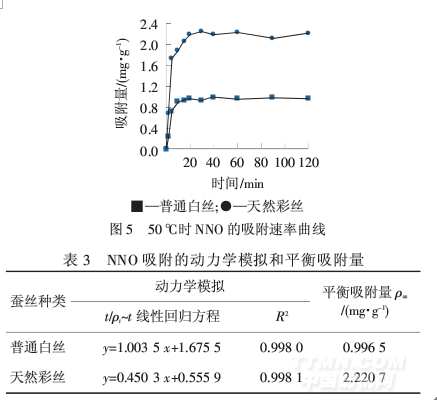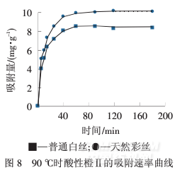 測出酸性橙Ⅱ吸附普通白絲和天然彩絲的速率曲線,結(jié)果如圖8所示.