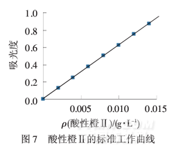 酸性橙Ⅱ的標(biāo)準(zhǔn)工作曲線如圖7所示,計(jì)算機(jī)擬合直線方程A=0.004 58+62.488 1ρ,式中A為吸光度,ρ為酸性橙Ⅱ質(zhì)量濃度,回歸系數(shù)為R2=0.999 9.