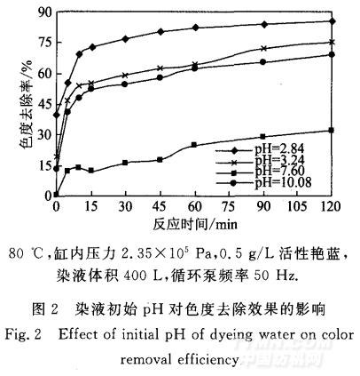 活性艷藍染液的初始pH值對色度的去除效果如 圖2所示.從圖可見,在PH為2.84 7.60(未調(diào)節(jié)) 時,色度去除率均隨著pH值的上升而有所下降,說明 低pH可以阻止自由基的自身無效損耗產(chǎn)生.隨著pH 升高,堿性溶液中的HCO3-。一將捕獲雙氧水裂解產(chǎn)生 的·OH自由基,使得氧化效率下降;此外雙氧水在強 堿液(pH﹥9.0)中不穩(wěn)定,容易分解成氧氣和水,溶解 氧亦具有一定脫色能力,但其氧化速率比·OH的氧化速率低l】 .因此pH值升至1O.O8時,色度去除率比中性(pH接近7)的反應(yīng)條件有所增加,但仍低于pH值為酸性時的結(jié)果.綜上,染液初始pH值選擇在3左右.