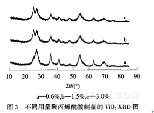 從圖3和表1可以看出,不同用量聚丙烯酰胺制得的TiO2在衍射角25.28。、48.O5。和27.45。、36.09。附近都有吸收峰,表明TiO2都以銳鈦礦型和金紅石型混合晶體存在.聚丙烯酰胺用量越大,銳鈦礦型TiO2含量越高,平均晶粒尺寸也越大.說(shuō)明在制備過(guò)程中加入聚丙烯酰胺,有利于銳鈦礦型TiO2的生成.