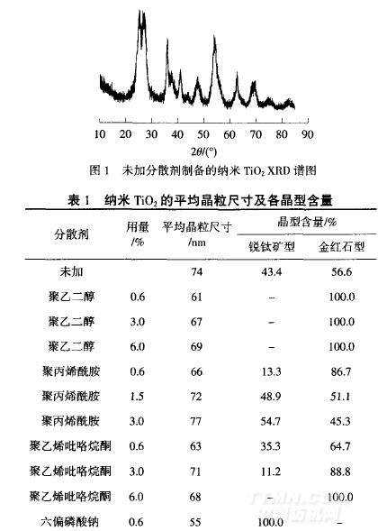 處有吸收峰,即在金紅石型TiO2標(biāo)準(zhǔn)XRD圖的3個(gè)最強(qiáng)峰位置有吸收峰,表明TiO2晶體中存在一定量金紅石型晶體,因此未加分散劑制得的納米TiO2是混合晶型.由表1可以看出,銳鈦礦型和金紅石型含量分別為43.4%和56.6%,平均晶粒尺寸為74nm.