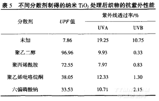 由表5可知,將聚乙二醇制備的乳液處理到織物上時(shí)UPF值最大,主要原因是加人聚乙二醇制備的TiO2晶體為金紅石型.根據(jù)功能需要,可以選擇制備金紅石型含量高的納米TiO2賦予織物較好的抗紫外性能.
