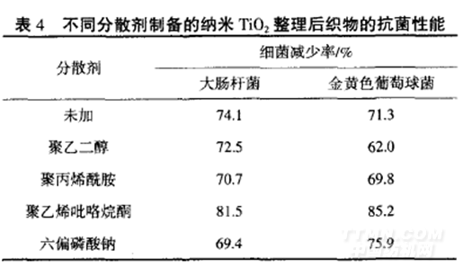 由表4可知,經(jīng)納米TiO2處理后棉織物都具有較好的殺菌能力.但加人不同分散劑制得的納米TiO2對(duì)抗菌性能有一定影響,當(dāng)加入聚乙烯毗咯烷酮時(shí),棉織物具有最強(qiáng)的抗菌能力,可能原因是此條件下制備的納米TiO2具有最高的光催化活性.