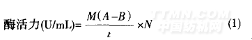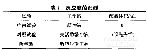脂肪酶活力:取100mL錐形瓶2個(gè),分別加入4mL橄欖油乳化液和5mL磷酸二氫鈉一磷酸氫二鈉緩沖液(pH7.5),置于40℃水浴中預(yù)熱10rain.加入lmL酶液,立即計(jì)時(shí),準(zhǔn)確反應(yīng)15min后迅速加入15mL乙醇終止反應(yīng).加入酚酞試劑2滴,用0.05mol/LNaOH標(biāo)準(zhǔn)溶液滴定至紅色為終點(diǎn).[5】記錄耗用NaOH的量,按式(1)計(jì)算酶活.空白試驗(yàn)時(shí),加入酶液前先加入乙醇.