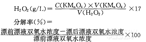 配制0.1 mol/L的高錳酸鉀標(biāo)準(zhǔn)溶液和6 mol/L的硫酸溶液,取5 mL過氧化氫漂液置于100 mL錐形瓶中,加人10 mlL6 mol/L硫酸溶液,然后用0.1 mol/L 的高錳酸鉀標(biāo)準(zhǔn)溶液進(jìn)行滴定,當(dāng)溶液自無色變成微紅色且半分鐘不消失即為終點(diǎn),記下消耗的高錳酸鉀體