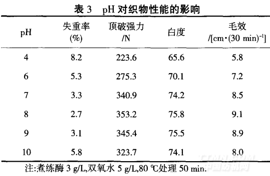 從表3可知,織物的失重率隨著pH的增大先減 小后增大,而織物的強(qiáng)力隨著pH的增大先增大后減 小,原因是強(qiáng)酸對纖維素纖維的損傷很大,纖維素發(fā) 生了降解,使得失重率較大,強(qiáng)力損傷嚴(yán)重;當(dāng)pH=7~9 時,失重率明顯比酸性條件小,對纖維素?fù)p傷較??;堿 性較強(qiáng)對纖維素也有一定的損傷,此時的失重率又有 明顯上升,強(qiáng)力也有下降;織物的白度和毛效都隨著pH的增大先增大后減小,但過酸或者過堿使得酶失 去活性,不能與雙氧水較好的發(fā)揮協(xié)同作用去除雜質(zhì), 使得織物的白度和毛效變化都很小.綜合考慮,選擇 pH=8.