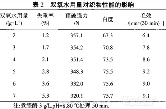 從表2可知,雙氧水用量高于5 g/L時,織物的失 重率增大比較明顯,主要是雙氧水用量適宜時雜質(zhì)氧 化溶解,而超過一定值以后,纖維素纖維被氧化(發(fā)生 降解),使得失重較大;當(dāng)>5 g/L時,強(qiáng)力損失比較明顯. 由于雙氧水適量時是對雜質(zhì)的去除,對織物強(qiáng)力影響 較小,當(dāng)超過一定量后纖維受到了潛在的損傷,使強(qiáng)力 下降趨勢明顯;而雙氧水用量超過一定值以后,對雜質(zhì) 的去除作用減小,使得白度和毛效提高不明顯.綜合考 慮,選用雙氧水用量為5 g/L.