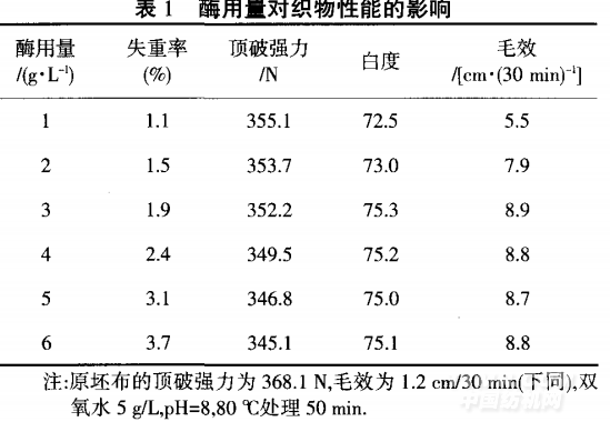 酶具有高效性和專一性,能打通纖維的內(nèi)部通道, 與纖維上雜質(zhì)相結(jié)合,并將其分解去除.從表1可知, 隨著酶用量的提高,織物上雜質(zhì)不斷地被去除,失重 率逐漸增大;酶的作用條件比較溫和,強(qiáng)力損失較??; 白度和毛效隨著酶用量的提高先增大,當(dāng)酶用量高于 3 g/L時,白度和毛效變化很小,原因是果膠一般存在 于纖維和蠟質(zhì)之間,把蠟質(zhì)粘在纖維上,在酶的作用下,果膠分解去除了蠟質(zhì)等雜質(zhì),使得白度和毛效提 高較快,可能是在3 g/L用量時,煮練酶對織物的作用 已經(jīng)基本完成,或是酶的活性已經(jīng)達(dá)到飽和.綜合考 慮,選取酶用量為3 g/L.