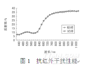 且在近紅外波長區(qū)間740~1040nm,試樣的反射率在30%~40%,可以達(dá)到抗紅外干擾的效果。