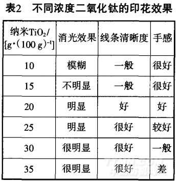 表2是不同濃度的二氧化鈦對(duì)印花效果的影響。從表2中可以看出,納米二氧化鈦濃度在20~35 g/(100 g)時(shí)消光效果明顯,線(xiàn)條清 晰度也較好,這說(shuō)明要得到明顯的 消光印花效果,效果劑必須具有一定的濃度;納米二氧化鈦濃度在 10~25 g/(100 g)時(shí),手感較好,如果 濃度大于25 g/(100 g)時(shí),雖然消光 效果好,但手感較差。這可能是由 于納米二氧化鈦濃度的增加。引起 涂料印花的涂層增厚,從而導(dǎo)致手感不好。