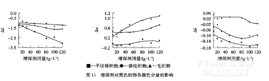 亮度值L代表織物表面反射光線的強(qiáng)度,△L為負(fù)值,說明增深后的布樣較增深前表面對(duì)光的反射能力降低了,織物顏色變得更深.從圖11可以看出,增深劑對(duì)三的影響與對(duì)織物K/S值的影響規(guī)律一致,在增深劑用量相同時(shí),其對(duì)3種織物的亮度降低的程度依